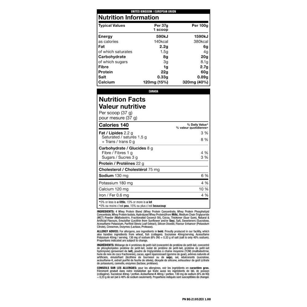 Ingredientes: Proteína concentrada de suero de leche, caseinato de calcio, proteína aislada de suero, caseína micelar, proteína hidrolizada de suero, maltrodextrina, sabores naturales y/o artificiales, aceite de girasol, jarabe de solidos de maíz (endulcorante),caseinato de sodio (agente espesante), fosfato dipotásico (agente leudante), fosfatos tricálcico  (agente leudante), lecitina de soya (emulgentes), mono y diglicéridos  de ácidos grasos (emulsionantes), sal yodada y fluorizida de apta para consumo humano, agentes espesantes (goma de celulosa, goma xantanas, carragenina), sucralosa y/o acesulfame de potasio (endulcorantes artificiales), mezcla de vitaminas y minerales (palmitato, vitamina A, ácido ascórbico, betacaroteno, tiamina, riboflavina, niacina, piridoxina, ácido fólico, biotina, carbonato de calcio, fosfato férrico , fosfato de yodo, oxido de magnesio, oxido de zinc, selenito de sodio, sulfato). Fabricado en una plata que también procesa ingredientes a base de trigo, huevo, nueces, maní y pescado.