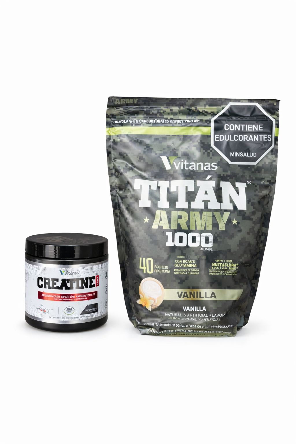 este combo contiene una proteina titan army 5 lb y una creatina vitanas 100 servicios