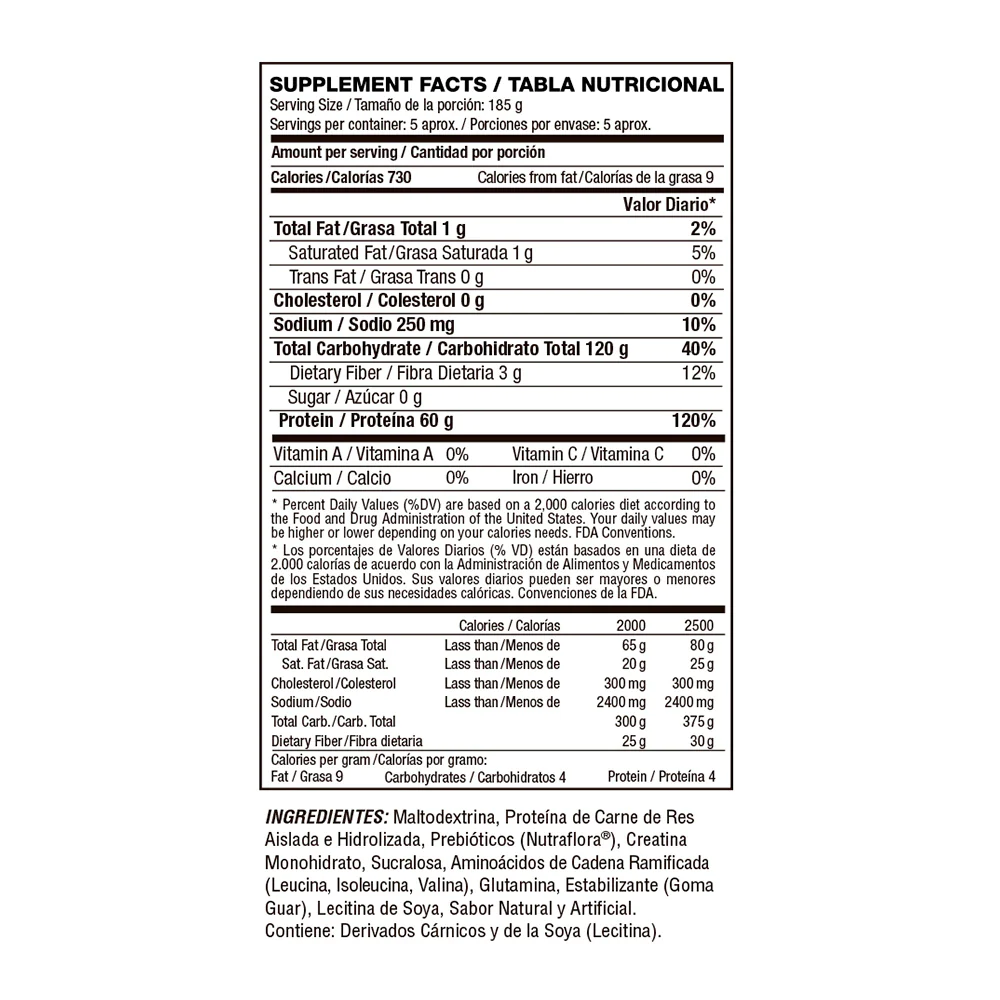 Ingredientes: Ingredientes: Mezcla de carbohidratos (Maltodextrina (almidon hidrolizado de maiz), almidon de maiz), proteina de carne de res aislada, aislado de soya, Crema no láctea (Jarabe de glucosa, aceite de palma, proteina, estabilizante, emulsificante y agente anticompactante), sabor natural y/o artificial (vainilla, caramelo), mezcla de gomas (goma guar y goma xantana)(espesantes), prebiótico, sucralosa (edulcorante artificial), aminoácidos de cadena ramificada (L-leucina, L-isoleucina y L-Valina), glutamina, dióxido de silicio (anticompactante), probioticos.