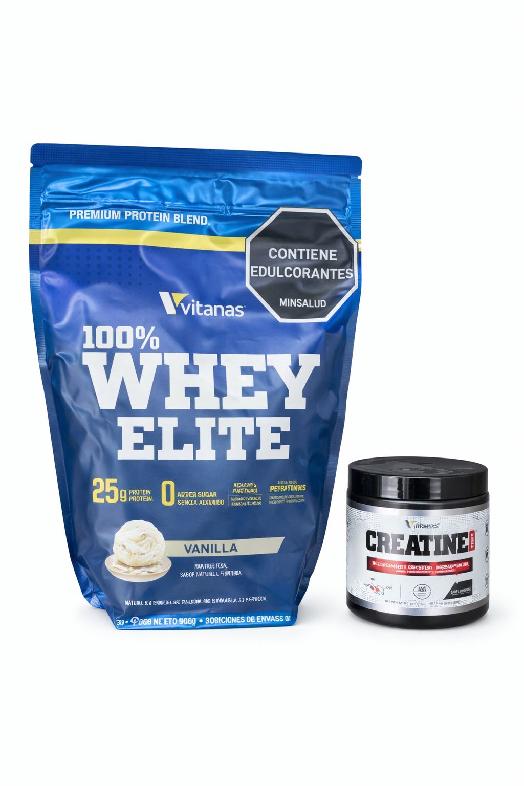 Este combo incluye whey elite 2 lb vainilla y una creatina de vitanas en presentación de 50 servicios